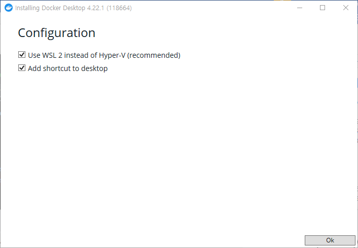 Use WSL 2 instead of Hyper-V (recommended) 는 윈도우 환경에서 리눅스 환경을 사용할 수 있게 해주는 거라는데 위와같이 기본값으로 설치했다. 끝나고 재부팅됨