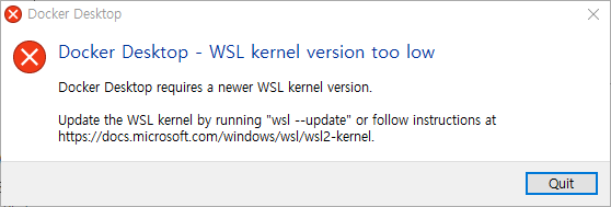 갑자기 뜨는 경고창. "Docker Desktop - WSL kernel version too low"