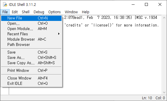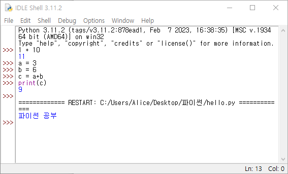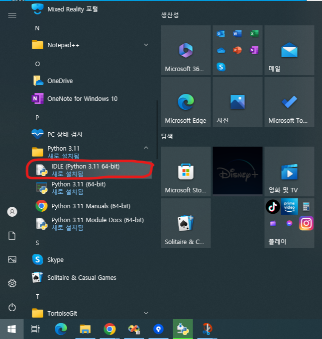[시작] 을 누른 뒤 파이썬 개발환경인 IDLE (Python 3.11 64-bit) 실행