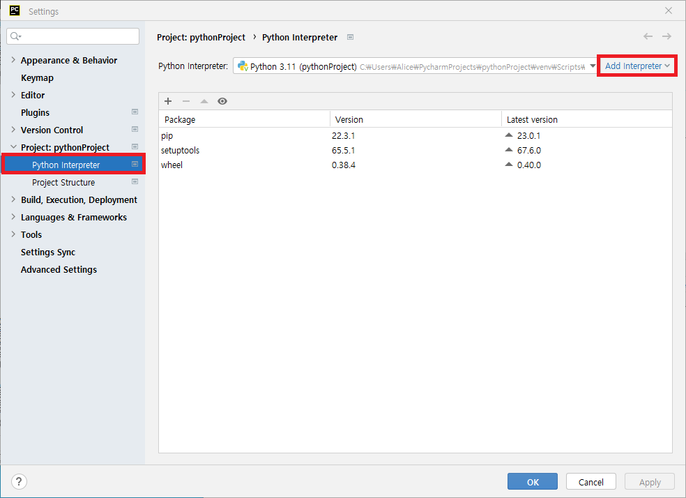 2. Python Interpreter 클릭