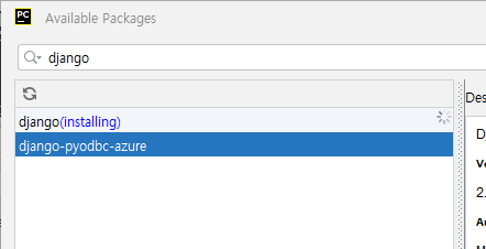 5. django 입력하여 선택 후, Specify version 을 체크한다. (기다리면, 설치할 버전에 대한 리스트가 표출됨)