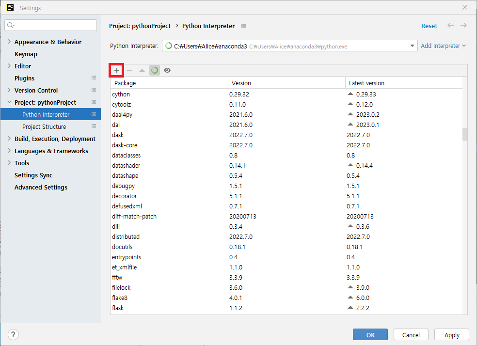 이 중 django를 찾아야하는데 만약 없다면 설치를 해야함. 찾아 설치하기 위해 + 버튼을 누른다.