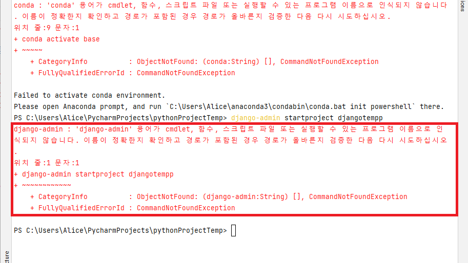 - 오류를 무시하고, 장고 프로젝트 생성 명령어(django-admin startproject 프로젝트명)를 입력하면 오류가 발생한다.