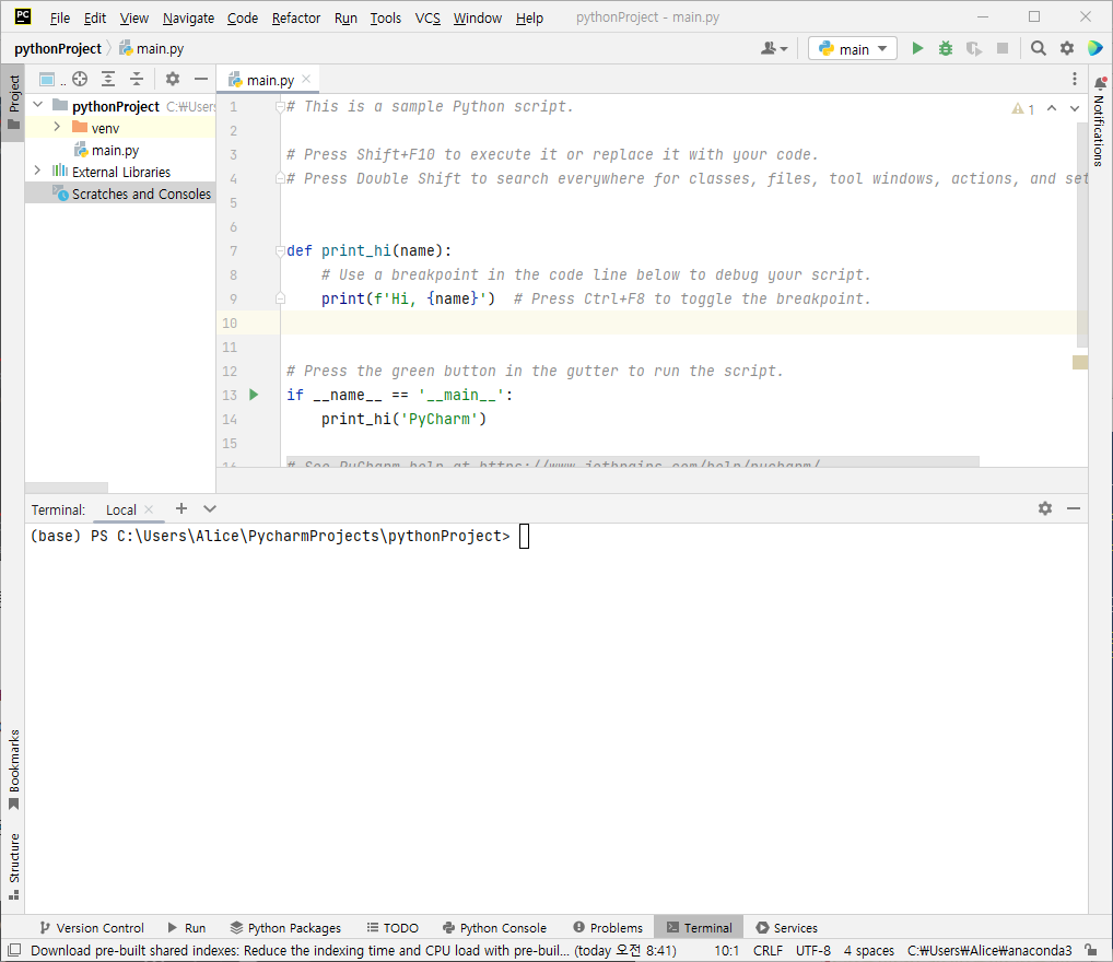 3. 파이참의 Terminal을 다시 켜면, 아까와 같은 오류는 표출되지 않는다.